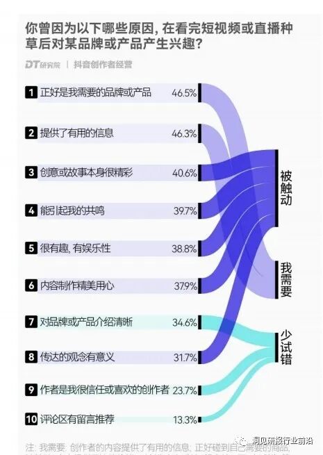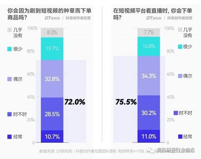 创作者在选择“带货”这一商业化方向时常常会在短视频挂车或开直播之间摇摆。从用户这边来看,会因为直播而下单的比例确实略高于短视频种草,但两种方式的差距很小。