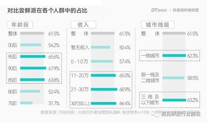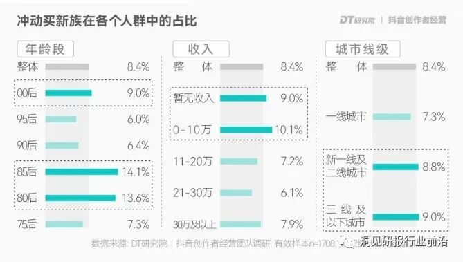 “冲动买新党”是短视频平台上最小众的消费群体,占比只有8.4%。他们时常买新,而且在买新前并不会做太多功课。
