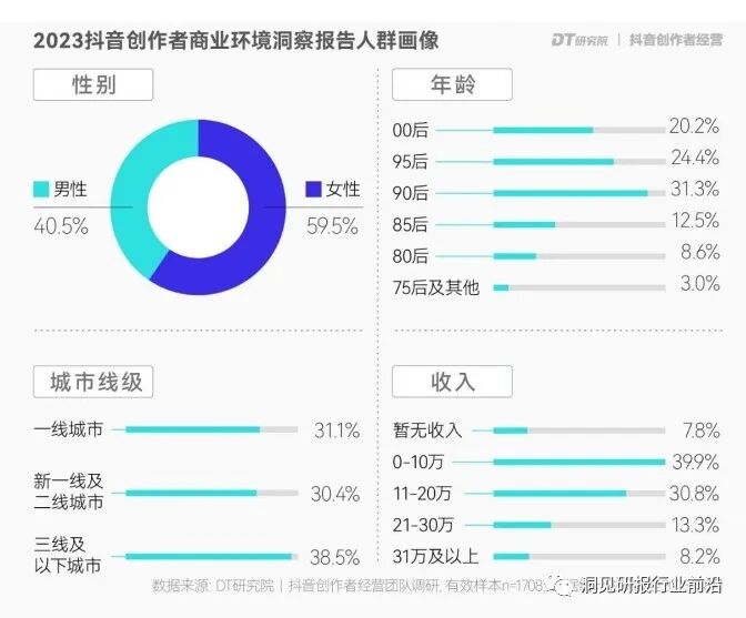 针对本次研究,面向使用过抖音平台的用户发起调研。本次调研共回收有效样本1708份,其中约6成为女性,近3/4为90后-00后,一线城市占比30%,新一线及二线城市占比30%。