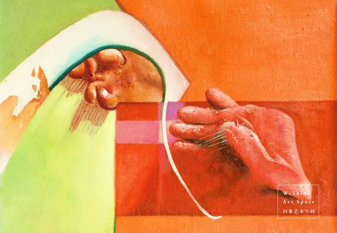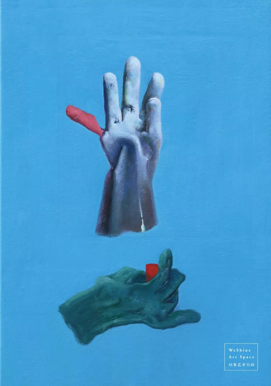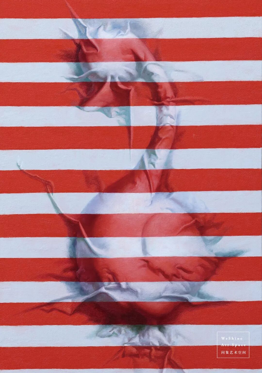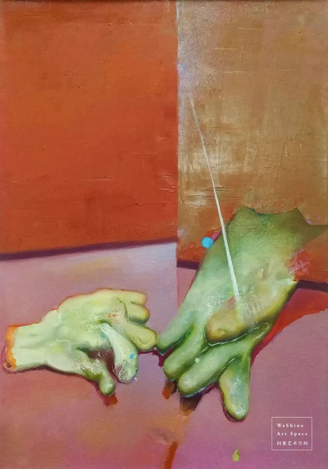 他的画作是对事物的“解剖”。《潮》系列,以“条纹布”为元素,秘密的、杂乱的、冲突的以及社会的多重性等包含其中,生物状或再生物的主体被放置于条纹布的背景,似乎掩盖了什么……。正如他言:“以一种意向性的衍生方式去阐释现实存在的多种变质,并将其异化为视觉上难以接受的,具有强烈生物性的状态,以条纹布作为普遍的‘皮肤’去支撑,无疑有着对等的意义”。可见,“条纹布”不是设想的“装饰”,而是强烈的批判语言。《手套》系列,让我想起席勒的同名诗,其情感表达的理性与感性相融,是他“叙事诗年”的代表。《手套》可归为叙事画作,画里的“手套”具有隔离又是手的延伸,而不是简单的赋予“颜值”。当它离开人的身体或随意被丢弃,它依然赋有“生命”和“余温”。在我看来,两者虽有语境之别,但皆为批判精神的契合,或是哲学,或是美学的。