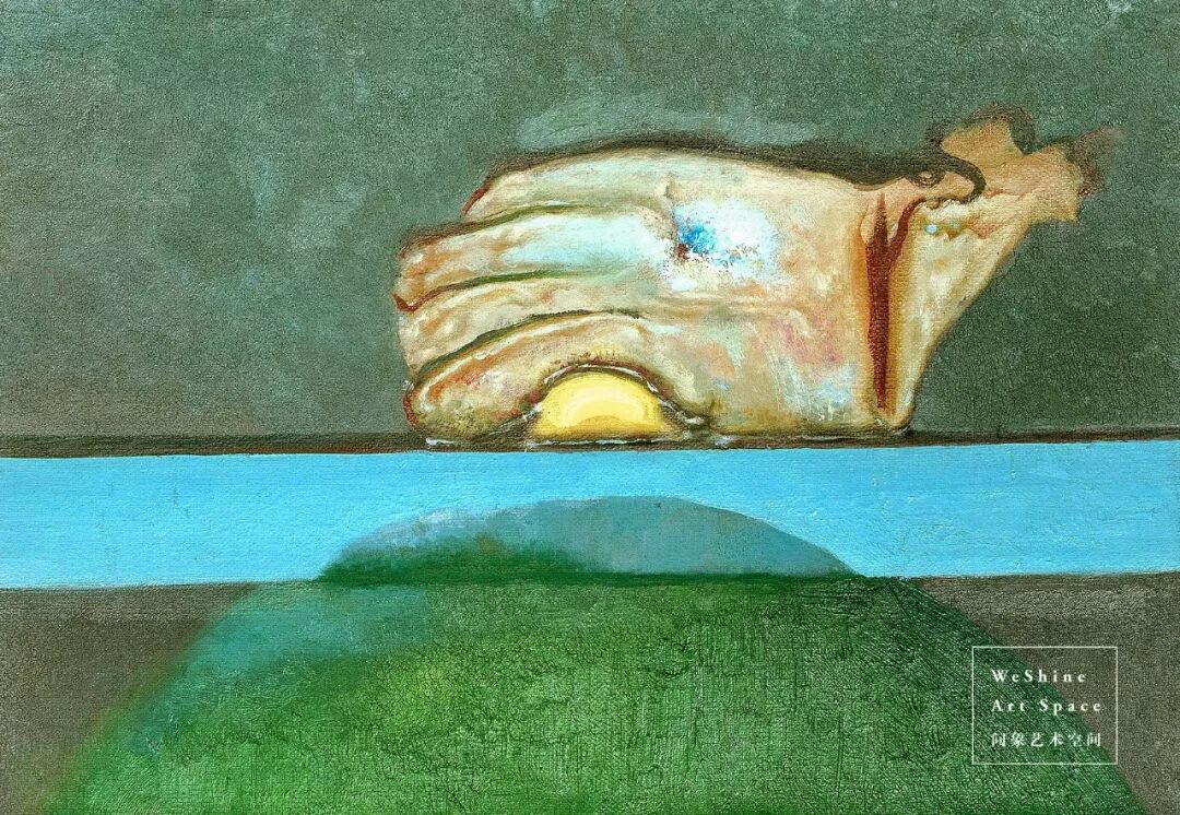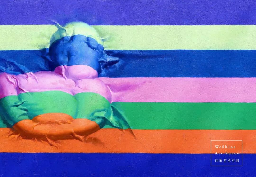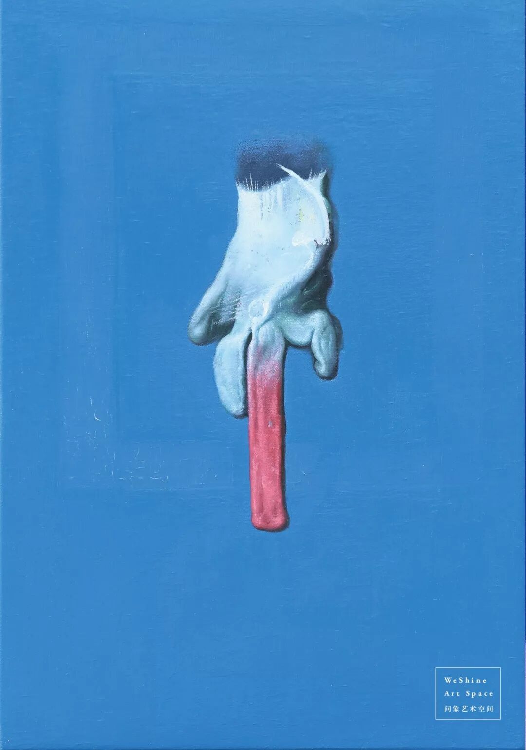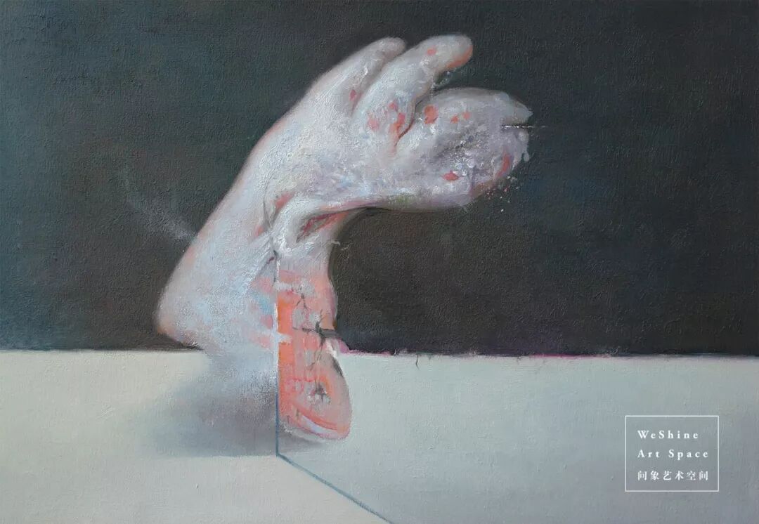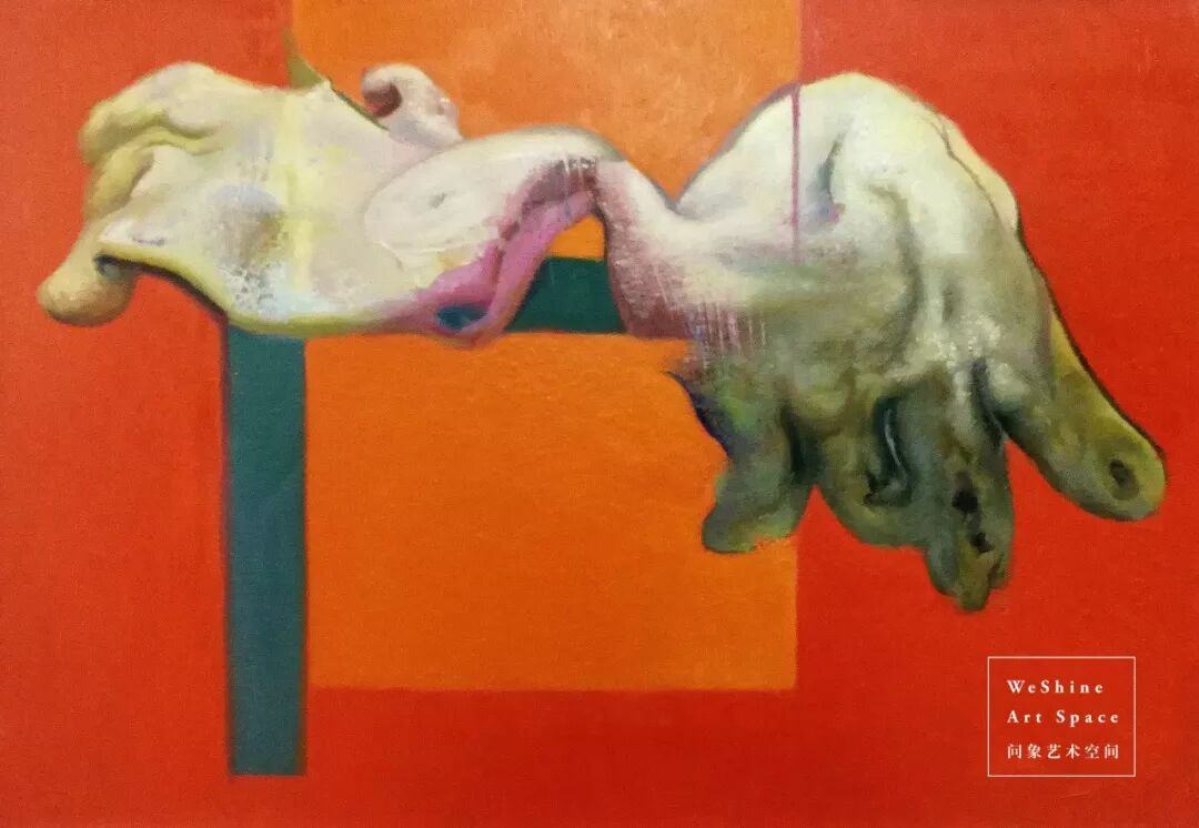 他的画作是对事物的“解剖”。《潮》系列,以“条纹布”为元素,秘密的、杂乱的、冲突的以及社会的多重性等包含其中,生物状或再生物的主体被放置于条纹布的背景,似乎掩盖了什么……。正如他言:“以一种意向性的衍生方式去阐释现实存在的多种变质,并将其异化为视觉上难以接受的,具有强烈生物性的状态,以条纹布作为普遍的‘皮肤’去支撑,无疑有着对等的意义”。可见,“条纹布”不是设想的“装饰”,而是强烈的批判语言。《手套》系列,让我想起席勒的同名诗,其情感表达的理性与感性相融,是他“叙事诗年”的代表。《手套》可归为叙事画作,画里的“手套”具有隔离又是手的延伸,而不是简单的赋予“颜值”。当它离开人的身体或随意被丢弃,它依然赋有“生命”和“余温”。在我看来,两者虽有语境之别,但皆为批判精神的契合,或是哲学,或是美学的。