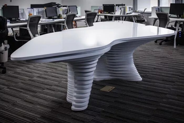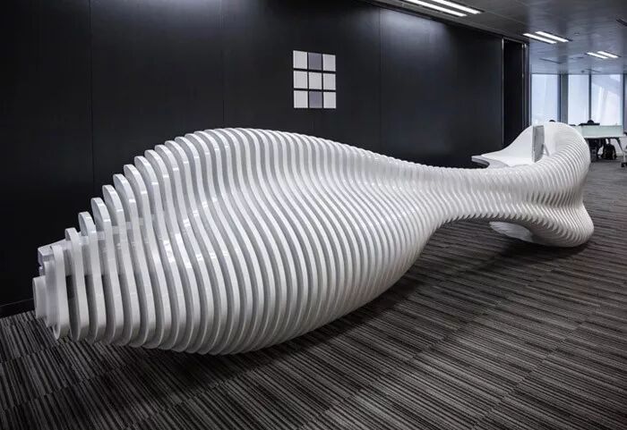 建筑设计事务所HWCD(HarmonyWorld Consulting & Design )在上海的办公室的前台与公共会议桌,造型独特,曲面造型与片状结构共同成就了如同雕塑般的流线形体