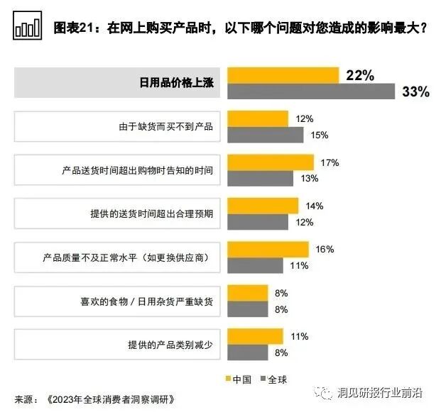 事实上,供应链问题也对网络购物者造成了影响,这表明网络购物环境中也可能会产生“摩擦”。在指出网上购物时“几乎总是或经常”遇到的问题时,22%的中国消费者提到了日用品的价格上涨。虽然这一比例在所有品类中最高,但仍低于全球消费者所回答的33%。