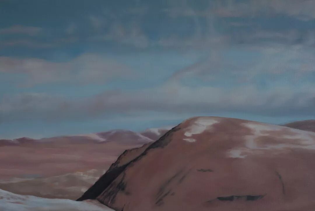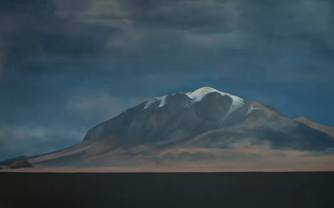 因为这个跟我之前的经历有关系,以前我画的是野生动物,我十多年跟着我先生,我们一起在亚洲的各个国家拍野生动物,每一次去到这些野生动物的地方都特别喜欢这也野生动物,也画了一些,现在这些野生动物生活的地方是地球几千年或者是几亿年保存最原始的一个状态,因为现在被破坏的特别多,被破坏的地方野生动物基本上是不能生存的,所以大概是5年前去到青藏高原,就被那边深深震撼了,因为那边保存着我们人类最珍贵的东西,就是水,因为我们知道人体百分之七十是水组成的,人类也是离不开水。然后青藏高原是被誉为世界第三脊,然后也是说是亚洲的水塔,我们水的资源都是在那边得以保存,所以人类可能最基础的基因是在青藏高原,就是最基本的生命的源头是在青藏高原,所以就被那片土地深深吸引,就从那个时候开始创作关于青藏高原的各种绘画作品,然后慢慢的集中到雪山上,因为我希望能用雪山来表达自己对那片土地的热爱,因为以前也画过一些关于那个地方的野生动物,然后后面转向到雪山,也是希望把那片土地的静物的状态用色彩来呈现出来给到大家。