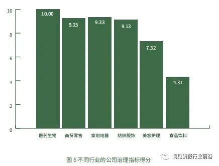 从二级指标“公司治理”维度来看,医药生物行业优势明显,其次是家用电器、商贸零售和纺织服饰,而美容护理和食品饮料行业的得分较低。