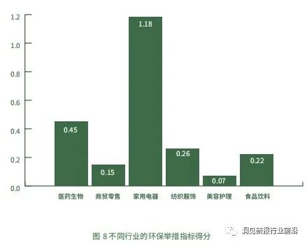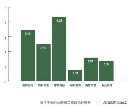 从“员工权益”维度来看,家用电器行业得分最高,其次是医药生物和商贸零售行业,而美容护理、食品饮料、纺织服饰行业均有较大提升空间;从“环保举措”维度来看,家用电器行业同样取得最高得分,并且与其他行业形成较大的领先优势。