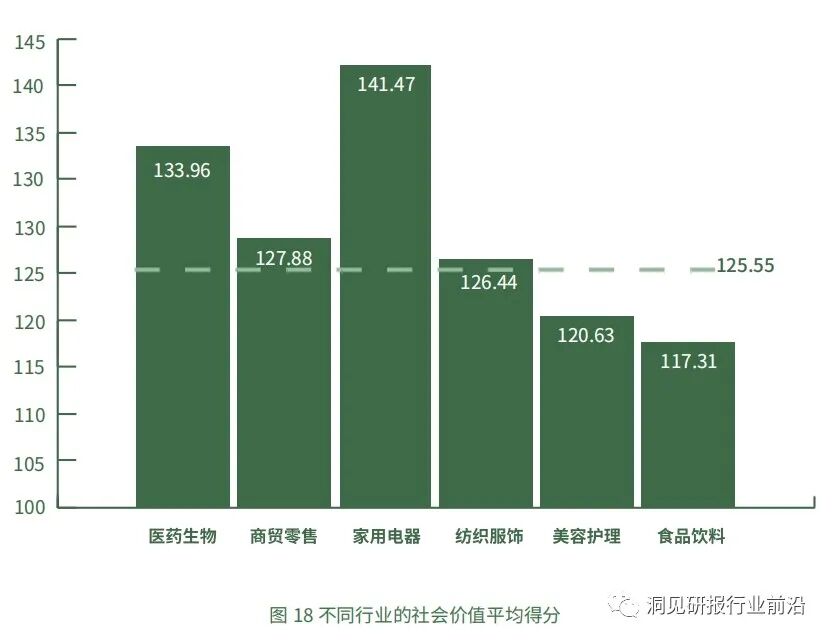 在头部企业中,家用电器是主体。家用电器和医药生物行业的社会价值得分均在 130 分以上,处于较为明显的领先地位。其次是商贸零售和纺织服饰,均在平均得分线左右。相比之下,美容护理和食品饮料的得分相对较低,均在平均得分以下。