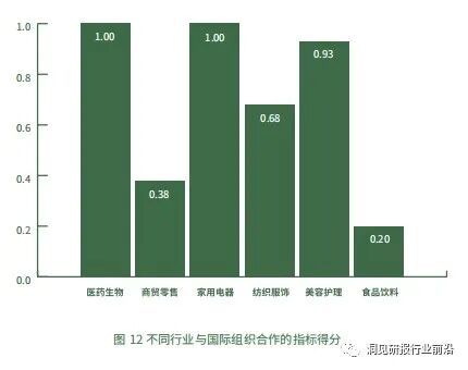 从与国际组织合作来看,消费行业整体表现不佳,分值均在低分段,其中商贸零售和食品饮料则发展空间最大。