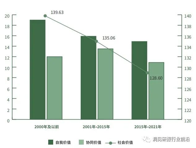 按照公开披露信息,本次研究将企业正式上市的年份作为判断时间先后的依据并将这部分企业按照2000年及以前上市(31家)、2001年-2015年上市(37家)2015 年-2021年上市 (39家)进行划分,形成“早、中、晚”的三个梯队并对其进行分析。处于越早的上市时间区间,自我价值和社会价值的平均得分越高。而在社会价值得分排名前五的企业中,上市时间集中在1993年-2011年间。