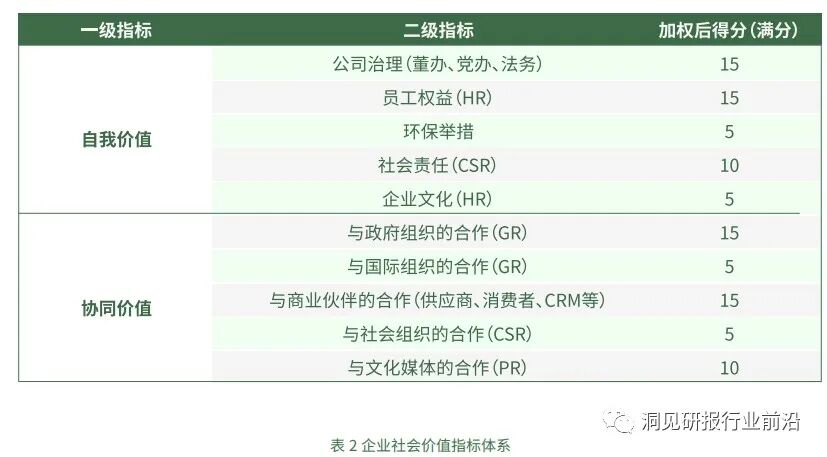 根据利益相关者模型,自我价值和协同价值分别包含5 个维度。其中自我价值包含公司治理、员工权益、环境保护、社会责任、企业文化协同价值包含与政府组织、国际组织、合作伙伴、社会组织、文化媒体的合作 5 个维度。