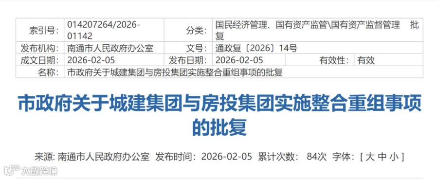 你委《关于城建集团与房投集团实施整合重组事项的请示》(通国资发〔2026〕6号)收悉。根据十三届市委常委会第170次会议和十六届市政府第68次常务会议精神,经研究,现批复如下: