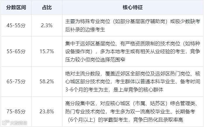 苏州事业单位2025年统考整体竞争呈现“高门槛、高分化、高热度”三大特征。全市平均竞争比达69.2:1,远超江苏全省平均水平,部分热门岗位(如苏州市属投资促进中心管理岗)竞争比突破623:1,堪比公务员考试。进面分65-75分区间占据半壁以上份额,是上岸竞争的关键战场;75分以上的高分段虽占比不足25%,但集中了核心优质岗位的录取名额,竞争尤为激烈。