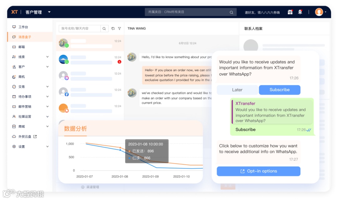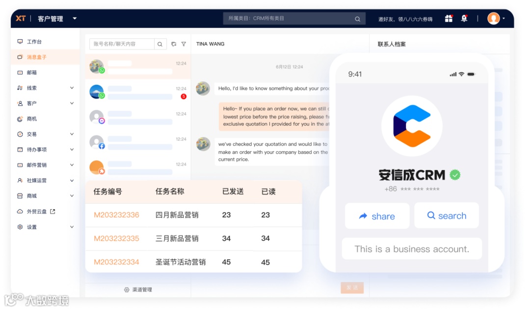官宣!XTransfer与全球社交网络服务巨头Meta(Facebook母公司)达成战略合作!XTransfer旗下外贸数智化客户管理平台安信成CRM,成为Meta旗下即时通讯产品WhatsApp官方伙伴,将与WhatsApp Business Platform共同推出基于外贸客户管理的数字化解决方案“企业WhatsApp”,助力外贸企业完成营销获客、私域运营、交易管理等在内的客户全生命周期管理!作为世界上最受欢迎的即时通讯软件,WhatsApp在全球拥有超过20亿月活跃用户,遍布180多个国家和地区。与此同时,相较于邮件营销,WhatsApp的打开率大大增加!而且通过WhatsApp发送消息,不需要先添加对方为好友,直接选择手机通讯录的联系人即可发送。通过消息后面的“√”的状态,你就可以实时知道对方是否收到消息、是否已读。外贸人如何将这样一款风靡全球的即时聊天工具与客户开发和管理相结合,精细化运营客户,促成订单成交呢?针对企业客户的需求,WhatsApp推出了WhatsApp Business Platform,以API接口方式提供企业级服务。这项服务可以与第三方数字化系统(如CRM)打通,支持数千名客服多对多沟通、机器人与AI应用。安信成CRM已完成WhatsApp Business的能力集成,并在安信成CRM产品内推出企业WhatsApp服务!相对于WhatsApp个人版,使用安信成CRM的企业WhatsApp,有哪些不同呢?