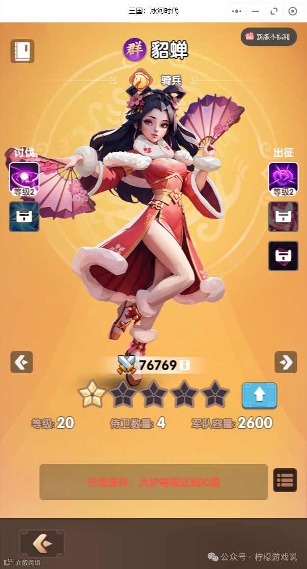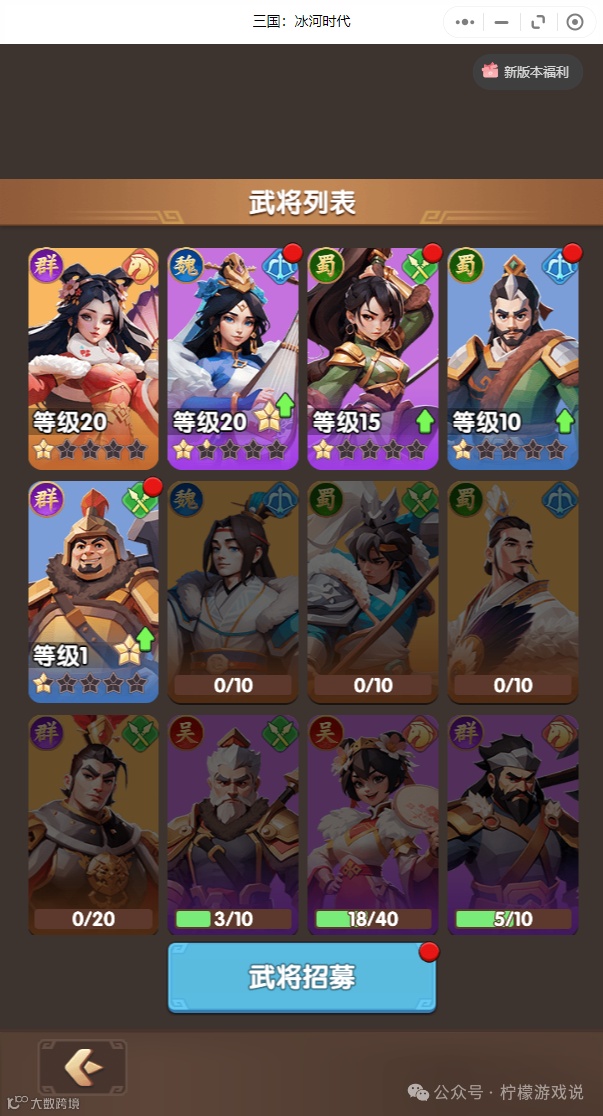 模拟经营;武将养成 模拟经营:升级建筑提高生产效率,并保持民心以及居民状态,以便有更好的工作效率。没有指令玩法 武将养成:卡牌通过抽取碎片进行解锁,通过经验进行升级,升级增加战力数值;通过碎片进行升星,升星增加更多战力数值,且增加野外玩法中的小兵百分比战力数值;技能跟随武将升星同时升级 |