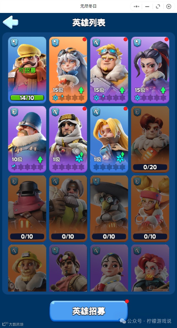 模拟经营;英雄养成 模拟经营:升级建筑提高生产效率,并提高居民健康以及幸福指数,以便有更好的工作效率。可颁布指令短时间内提高建造、生产等效率。 英雄养成:卡牌通过抽取碎片进行解锁,通过经验进行升级,升级增加战力数值;通过碎片进行升星,升星增加更多战力数值,且增加野外玩法中的小兵百分比战力数值;技能升级可增加技能百分比数值 |