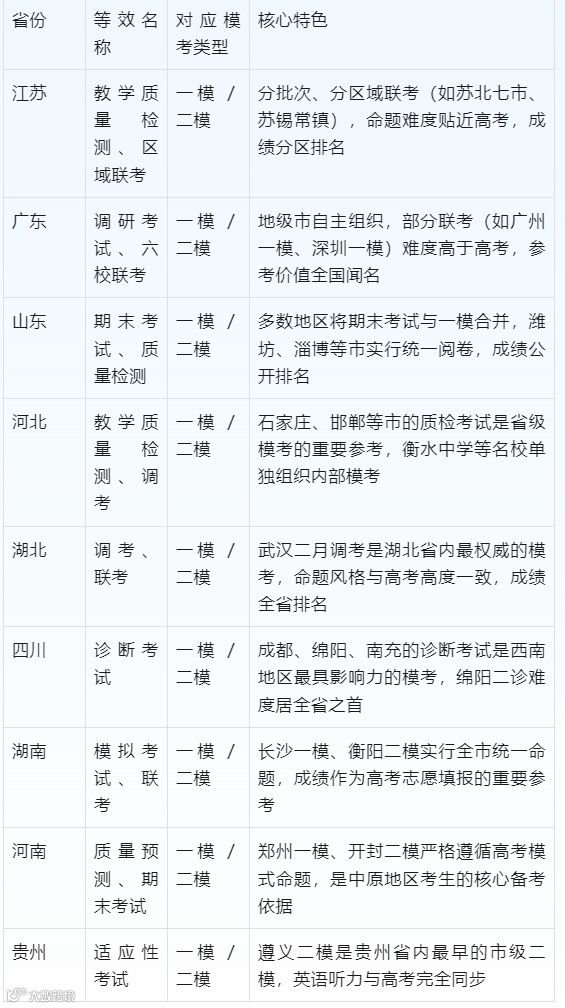 由于各地教育管理模式不同,模考命名存在显著差异,部分考试虽未直接命名为 “一模”“二模”,但实际功能完全等效。以下为部分省份的模考特色与等效名称对照表: