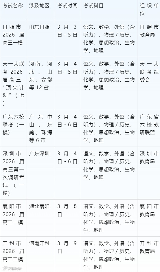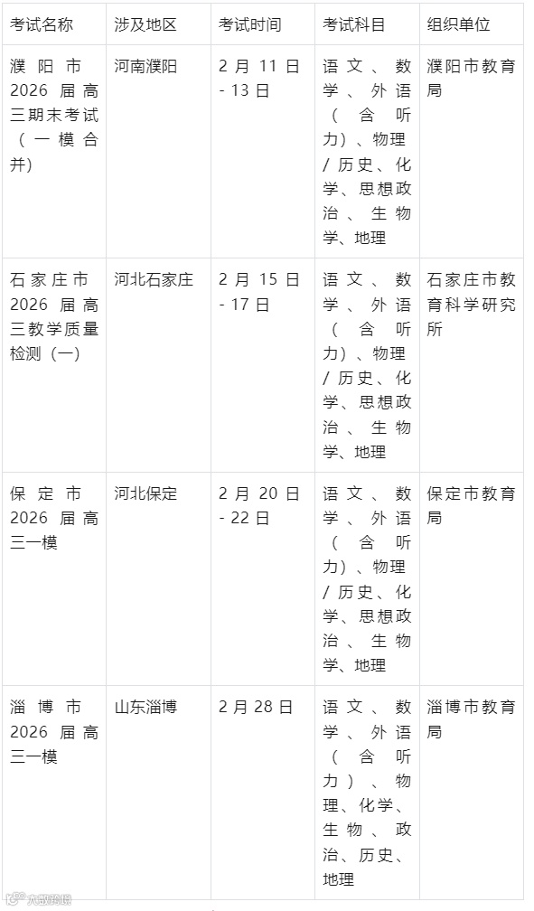 2 月是 2026 届高三寒假后首次大型模考的集中期,多数考试为一轮复习后的首次全面检测,部分地区将其与期末考试合并。