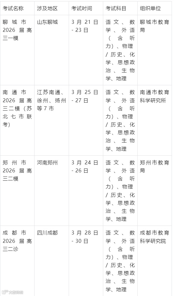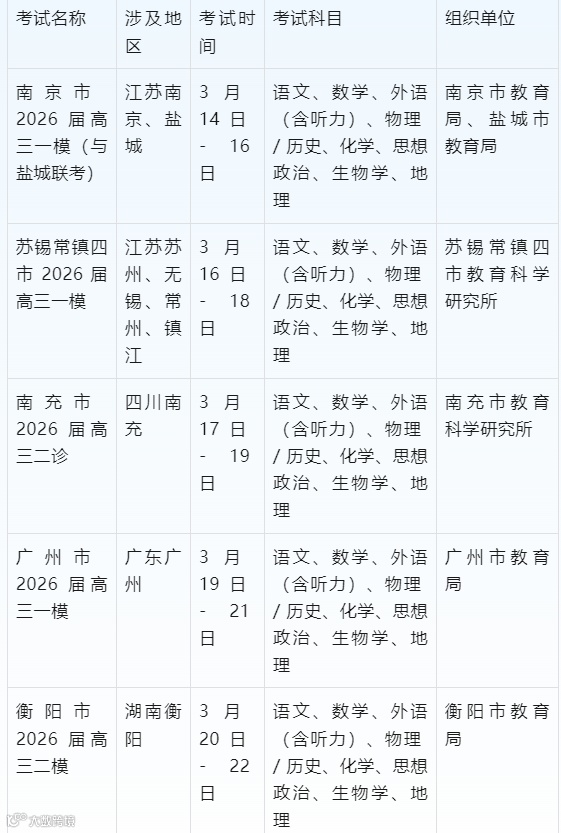 2026 年全国 2-3 月高三模考呈现出区域化、标准化、联考化的核心特征,尽管各地命名存在差异,但考试功能与高考导向高度统一。对考生而言,精准把握所在地区的模考时间与科目,结合自身实际制定备考策略,是提升高考竞争力的关键。建议考生及家长密切关注当地教育部门的官方通知,以最新信息为准安排备考计划。