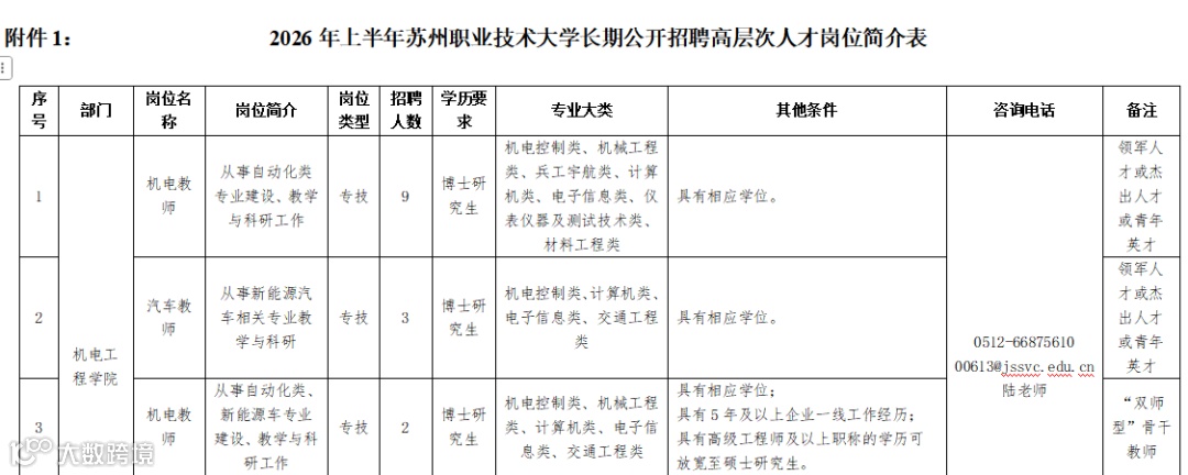 招聘岗位及条件等详见《2026年上半年苏州职业技术大学长期公开招聘高层次人才岗位简介表》(附件1)