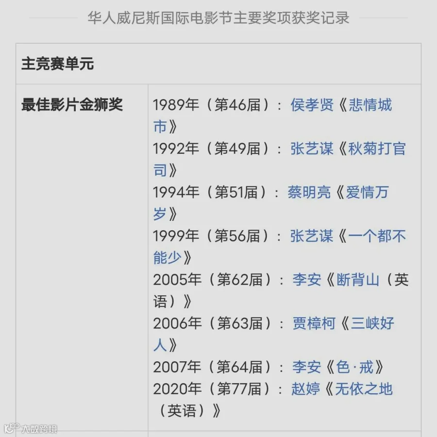 1993年,《霸王别姬》(陈凯歌导演)获第46届戛纳国际电影节最高奖项主竞赛单元金棕榈大奖,是华语电影第一次、也是至今唯一一次获得此大奖。