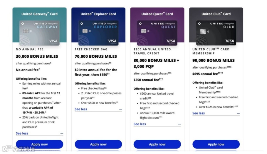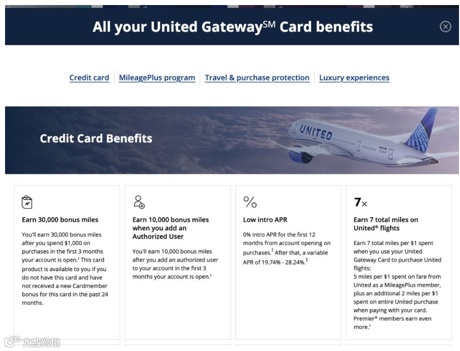 【2026.2 更新】美国联合航空(United)Gateway 美国运通卡更新开卡奖励,目前总奖励可达 40,000 英里。新户申请可享开卡三个月内消费满 $1,000 获 30,000 英里,加发一张副卡再送 10,000 英里。作为一张无年费信用卡,该卡在本地交通、餐饮、加油及 UA 官网购票等类别提供 2x 返现,具备一定持有价值。