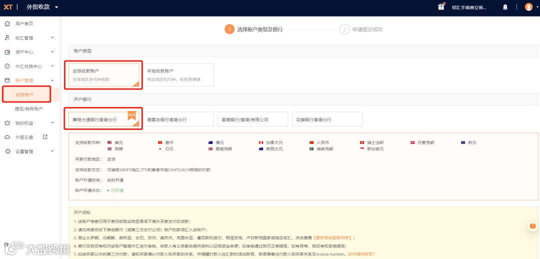 如果您已经是XTransfer认证用户,可直接登录XTransfer外贸收款后台,点击左侧的【账户管理】-【收款账户】,选择【全球收款账户】,根据页面提示操作即可快速开通!