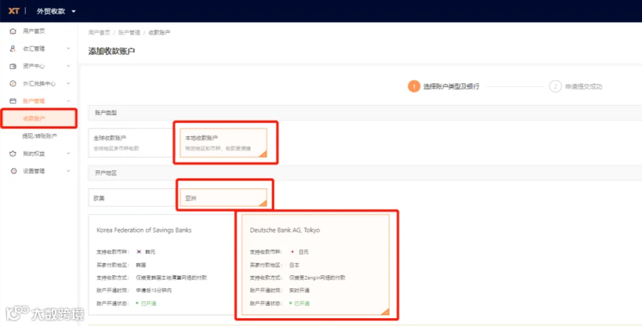 如您需要开通日本本地收款账户,则选择【亚洲地区】-【日本账户】,再根据页面提示操作,即可快速开通!