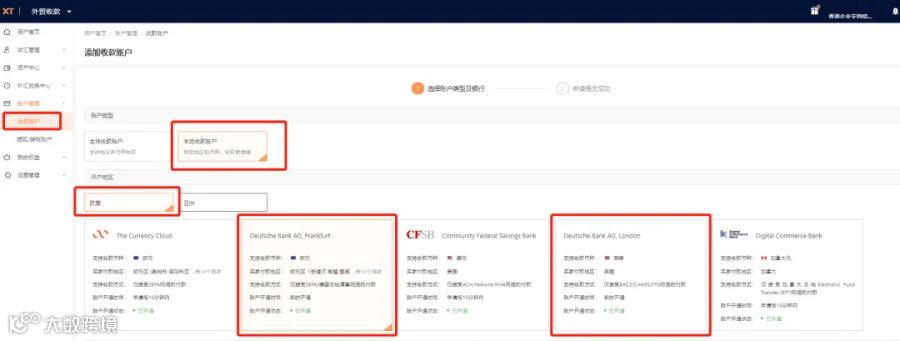 如果您已经是XTransfer认证用户,可直接登录XTransfer外贸收款后台,点击左侧的【账户管理】-【收款账户】,选择【本地收款账户】-【欧美地区】-【英国账户】/【欧元区账户】,根据页面提示操作即可快速开通!