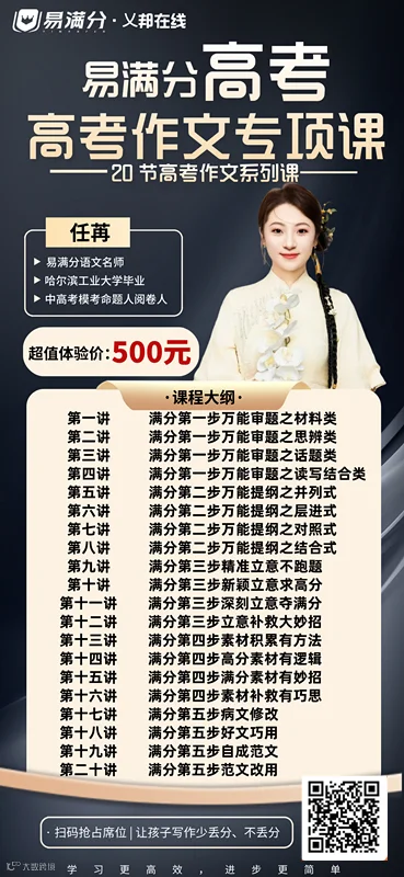 【易满分高考作文专项课】 精准对标高考评分标准,一线名师亲授“黄金结构+高分模板”,教你巧用热点素材、升华立意。256字内速成亮眼开头结尾,掌握审题破题秘籍,避开扣分雷区。