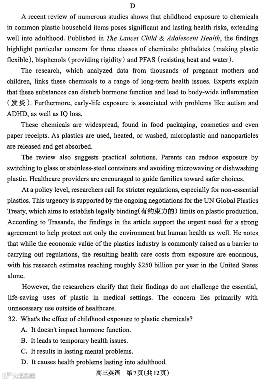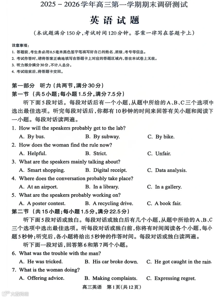 【太原高三期末全科】2025年太原高三第一学期期末试题及答案全含听力