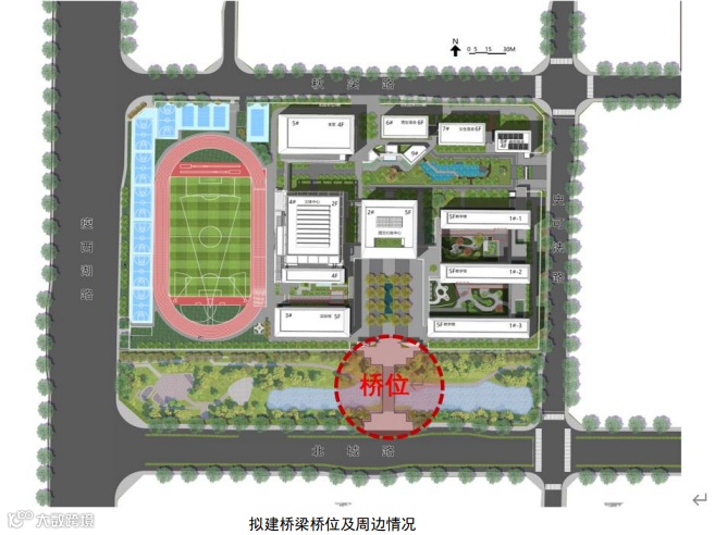 拟建桥梁位于新校区礼仪轴线上,上跨北城河,南接北城路,北接校园南侧行人出入口,是新校区重要的行人通道。