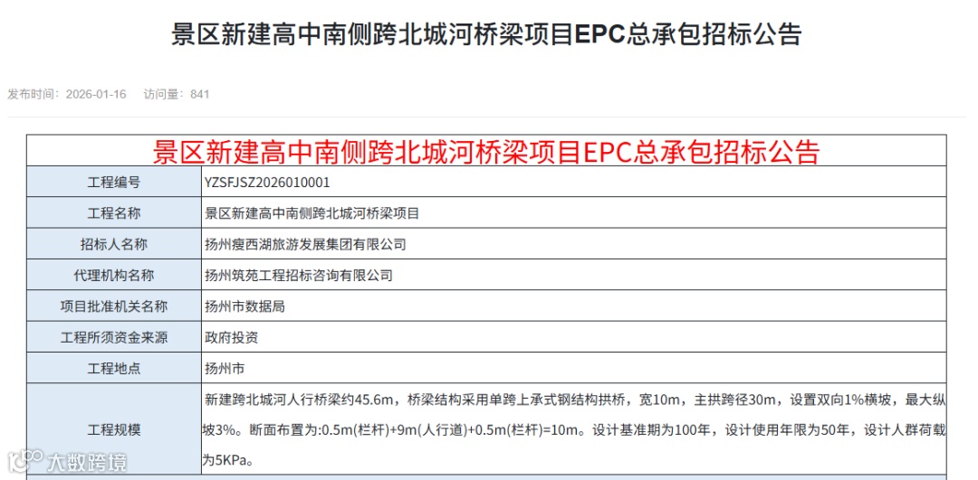 近期,扬州市公共资源交易中心发布《景区新建高中南侧跨北城河桥梁项目EPC总承包招标公告》