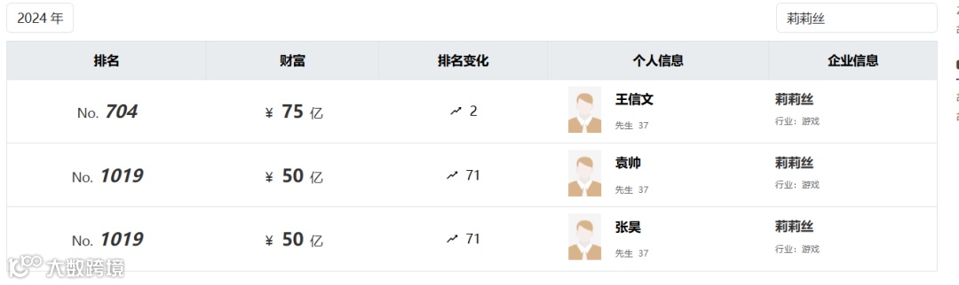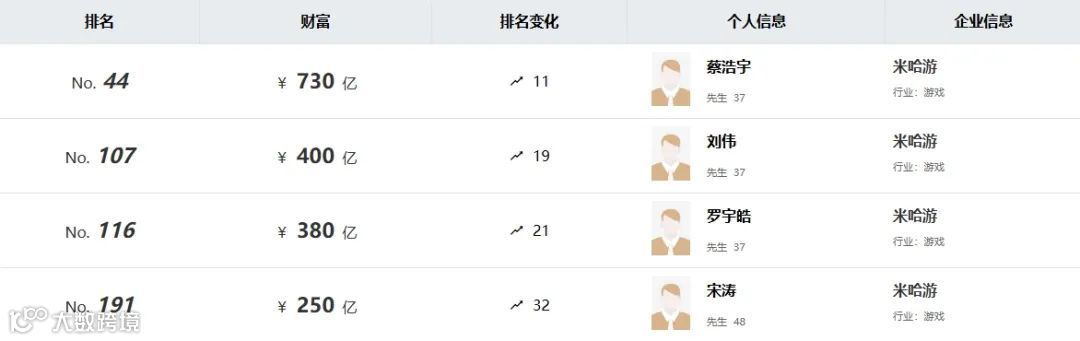 值得一提的是,在2024年,胡润继续为米哈游四位股东(蔡浩宇、刘伟、罗宇皓、宋涛)给出1760亿元的总和身价,相比去年没有变化,但三人的排名均有提升了10-30名。