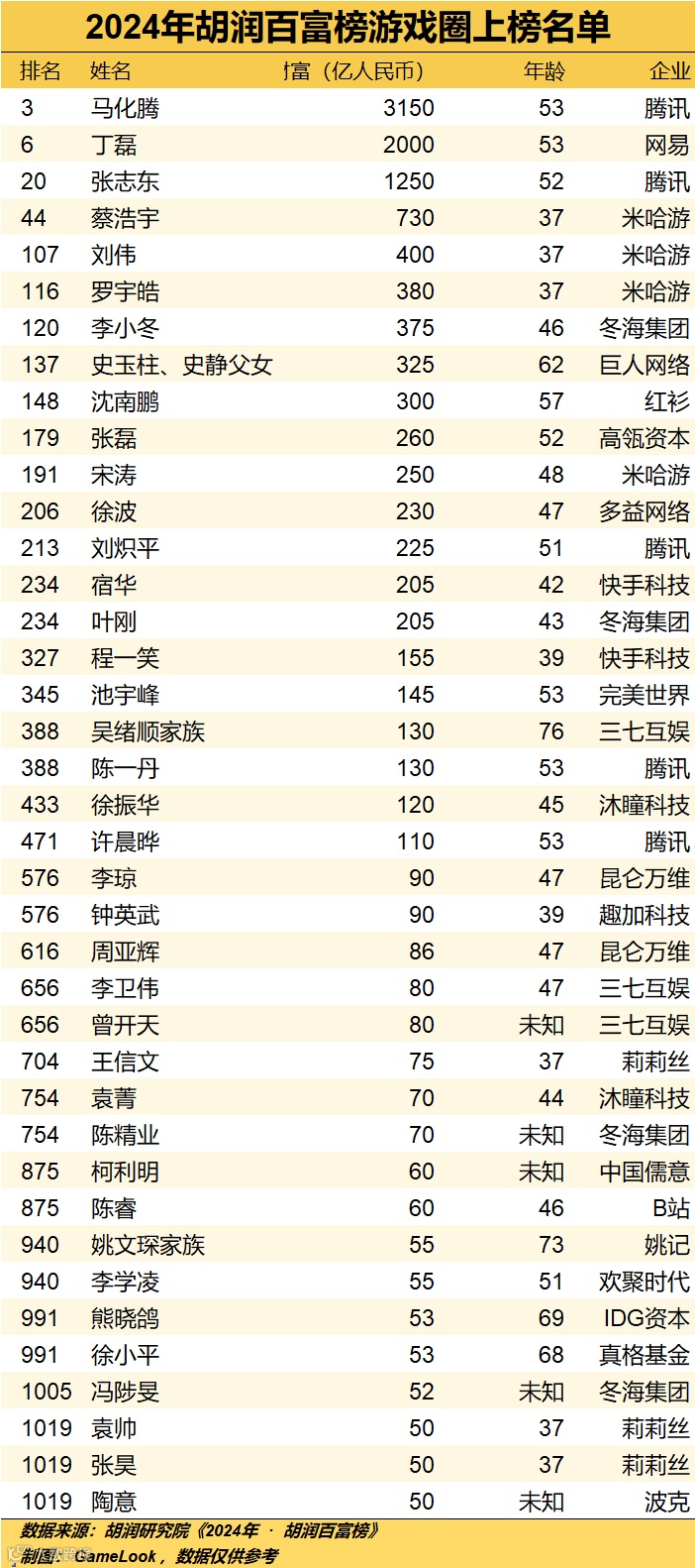 不过GameLook也注意到,不少行业内较大规模的游戏公司并未在胡润百富榜中露面。其中有诸如叠纸、鹰角等未上市的游戏圈新贵、也包括世纪华通等已上市的游戏股“龙头”企业。这也意味着,在胡润的统计范围外,游戏圈还存在着不少“隐形富豪”。