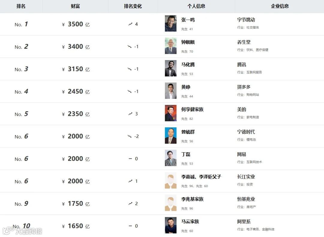 其它身价排名前十的富豪里,我们熟悉的互联网圈大佬排名变动不大。马化腾、黄峥、丁磊三位企业家均较去年下滑一位,分别位居第3、4、7位。而马云则以1650亿元的身价,继续位居第十名。