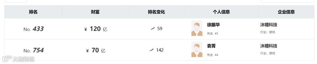 其它登榜的游戏圈富豪中,三位来自三七互娱、三位来自莉莉丝(王信文、袁帅、张昊排名提升70名)、两位来自沐瞳科技(徐振华、袁青排名提升60-140名)、四位来自冬海集团SEA。此外,姚记科技创始人姚文琛、完美世界创始人池宇峰、波克城市创始人陶意也登上胡润百富榜。