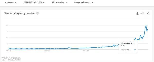 Google Trend 数据显示,今年全球范围内“万圣节(halloween)”的搜索热度从七月就开始上升,九月底作为一个重要节点热度开始飞速上涨,商家也进入宣传营销的冲刺期。