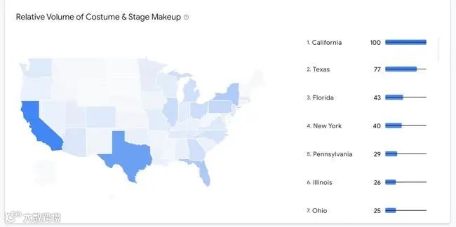 通过对万圣节相关热门品类的搜索数据查询,我们可以进一步看到,加利福尼亚洲对相关商品最为关注,其次是德克萨斯、弗罗里达、纽约等地。老板们在进行社交媒体营销时,可以进行更精准的地域投放 。