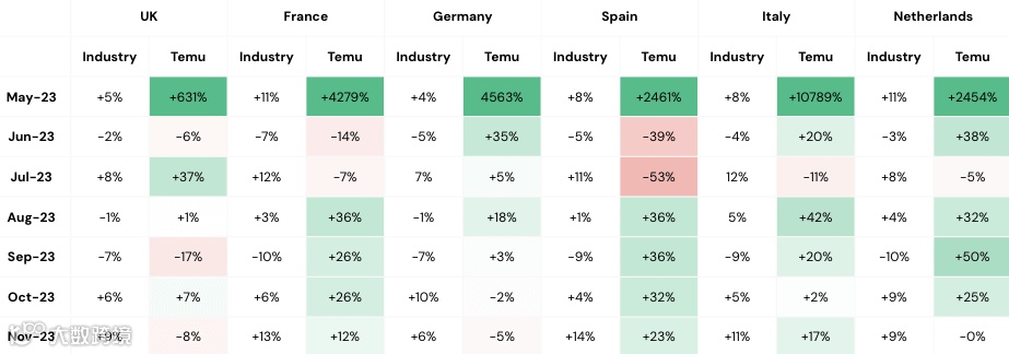 短短几个月的时间,就迅速占领了欧区各国的市场流量份额,并且流量增长持续呈现上升趋势,总体表现经常优于整体电商行业。