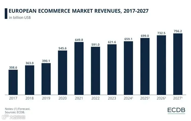 在欧区电商市场中,英国、德国、法国和意大利等国家占据主导地位,合计约占欧洲电商市场规模的62%。