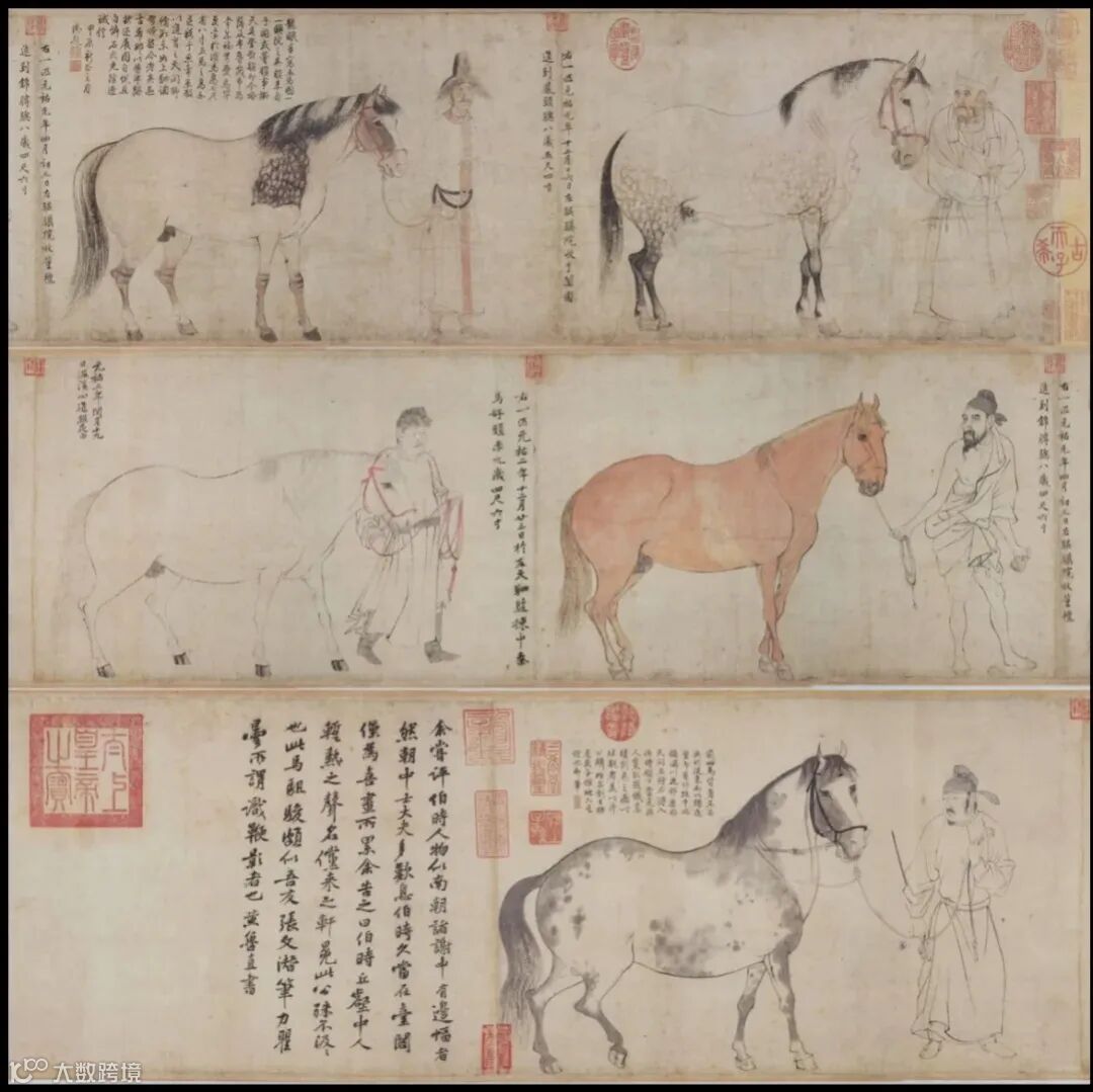 宋元时期,马形象转向文人意趣。北宋李公麟的《五马图》将唐绢上的“设色马”引入水墨境界,通过“铁线描”精细勾勒与淡墨晕染,捕捉骏马形神与动态。宣纸上的马褪去“肤色”,只存“骨相”,以墨色浓淡表现马的冷暖饥饱与喜怒。