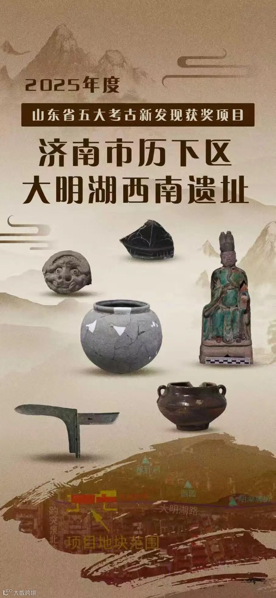 大明湖西南遗址位于济南市历下区趵突泉北路与大明湖路交叉口东北部、大明湖西南部。遗址自大汶口文化中期延续发展至今。本次发掘共发现龙山文化至近现代的城墙、壕沟、房址、经幢等各类遗迹206处;出土陶、瓷、铁等各类文物460余件,钱币130余枚。