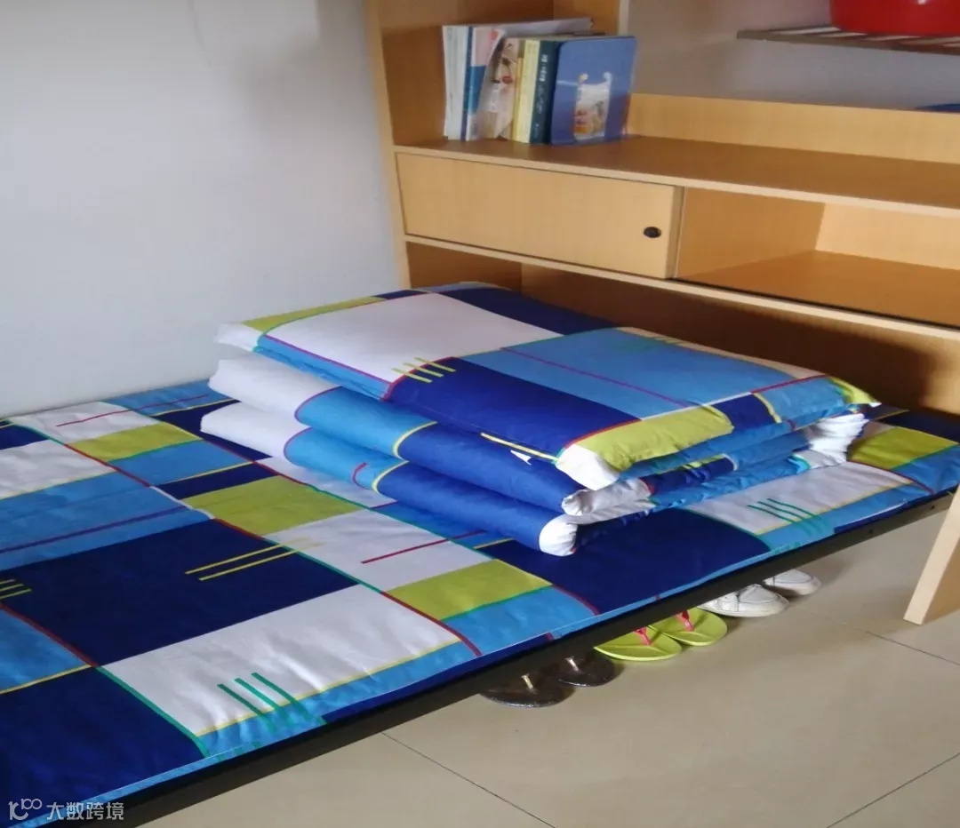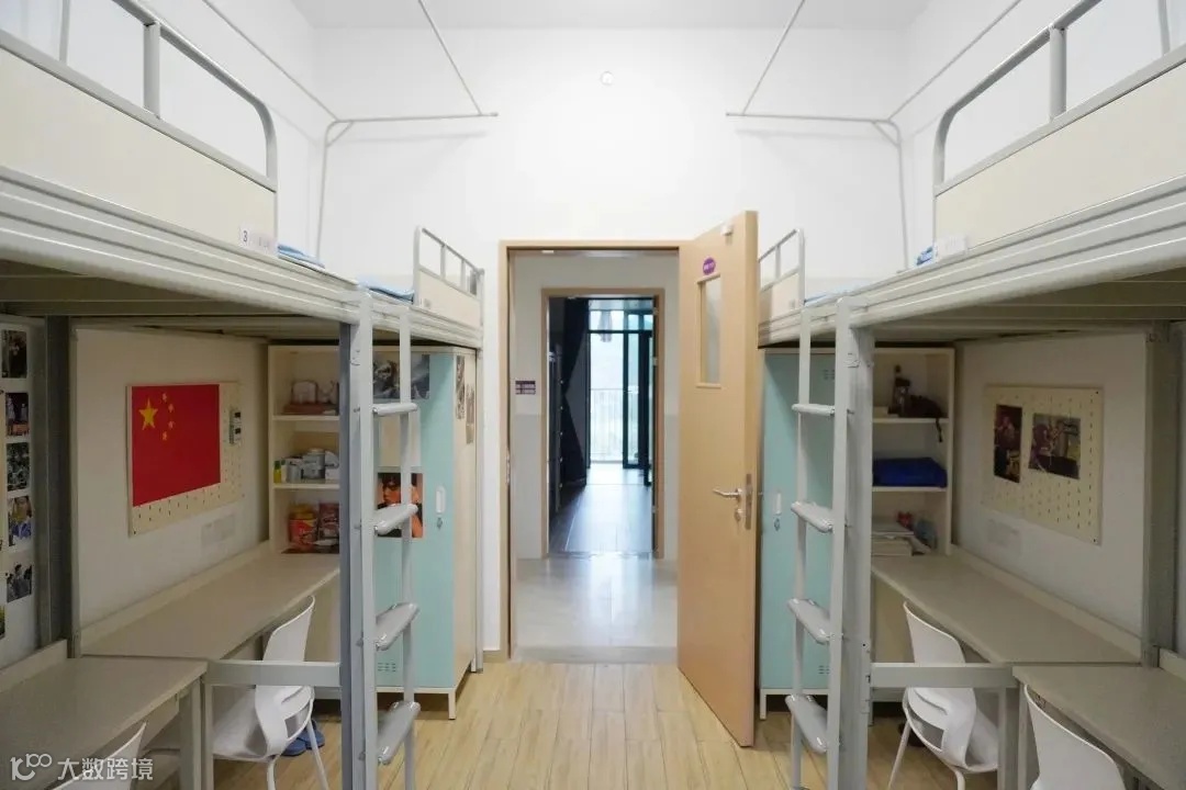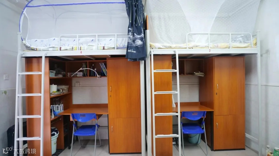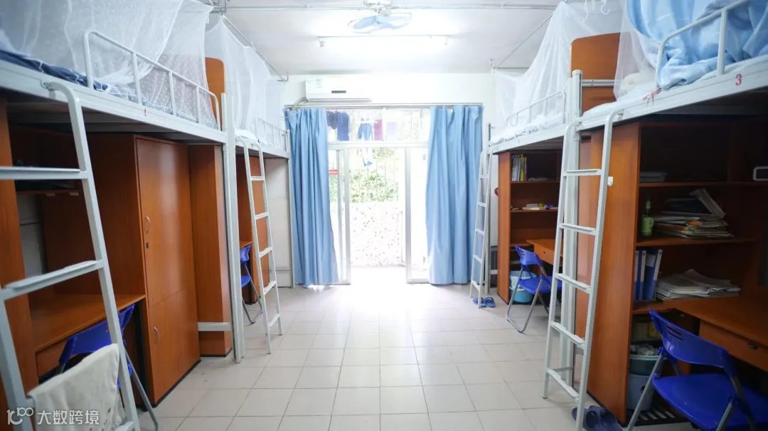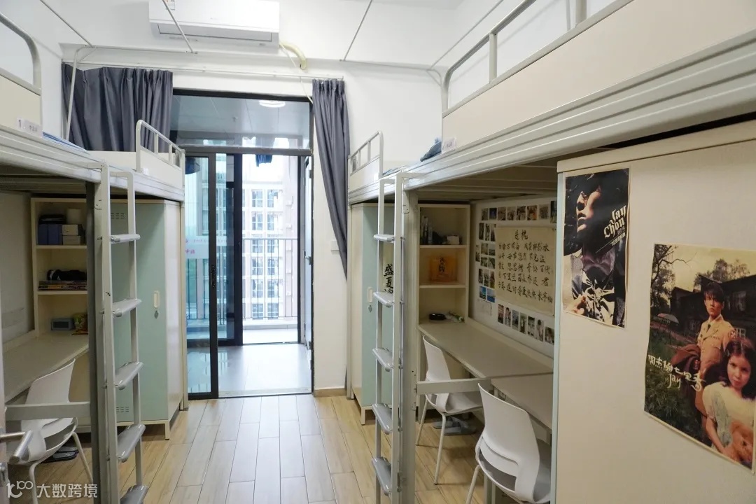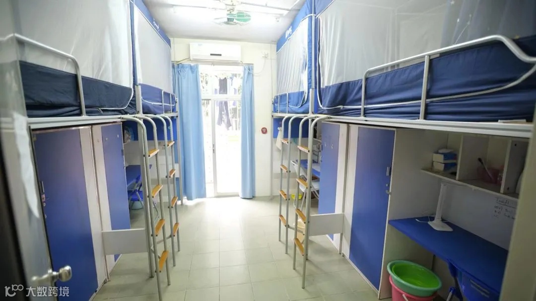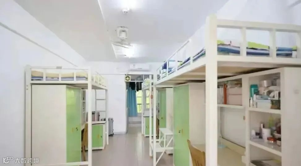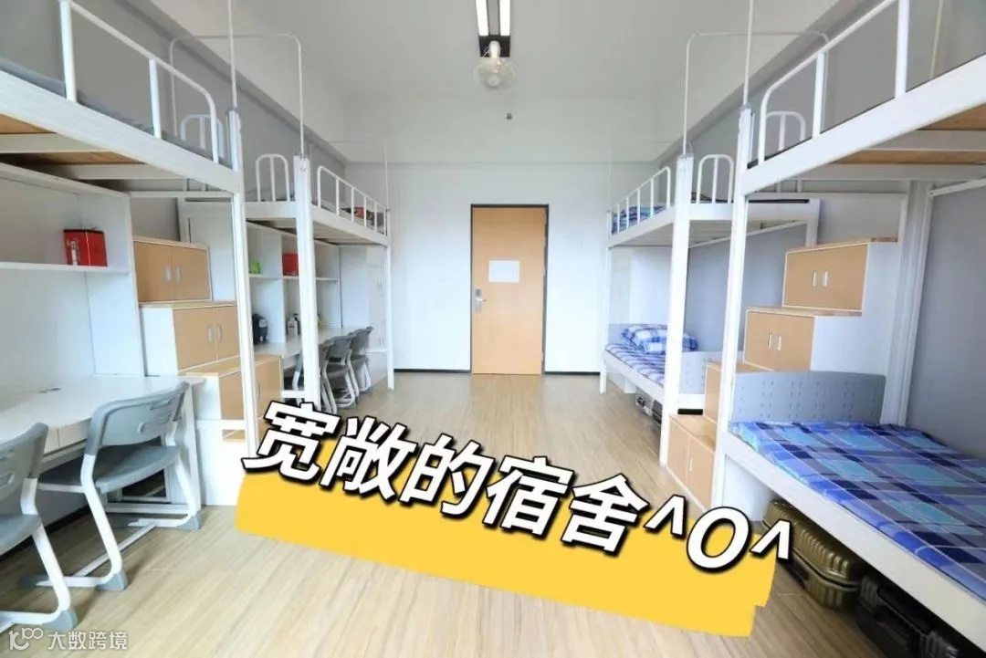 配置:每个校区都有独立的学生公寓,也装有热水系统, 4名学生住一间宿舍,一间宿舍内有阳台、卫生间、独立浴室,同时还有空调。