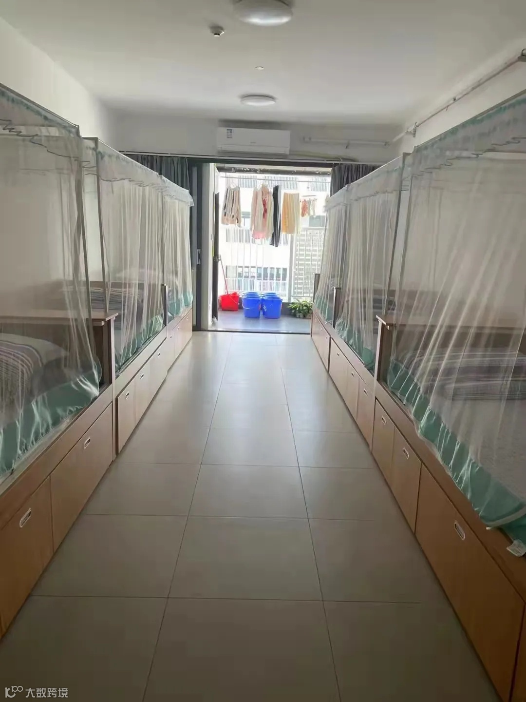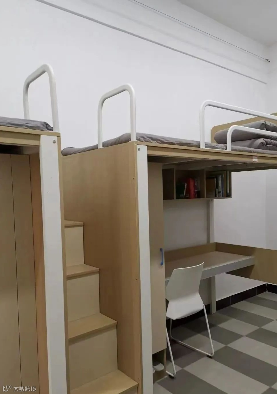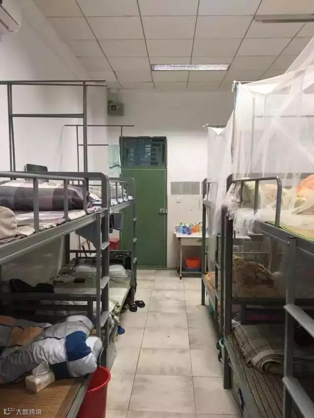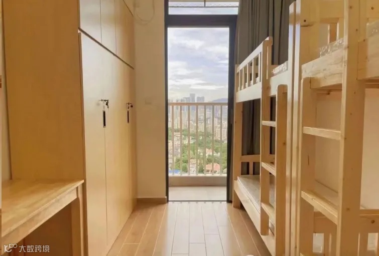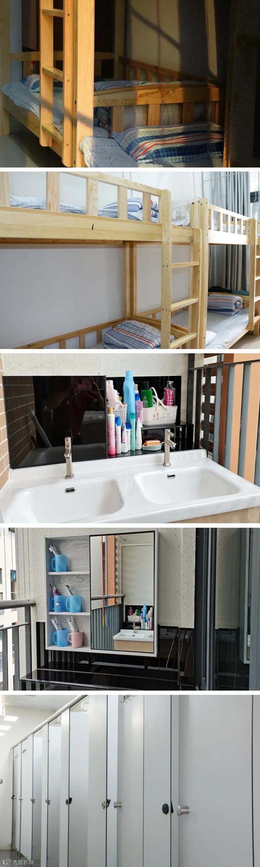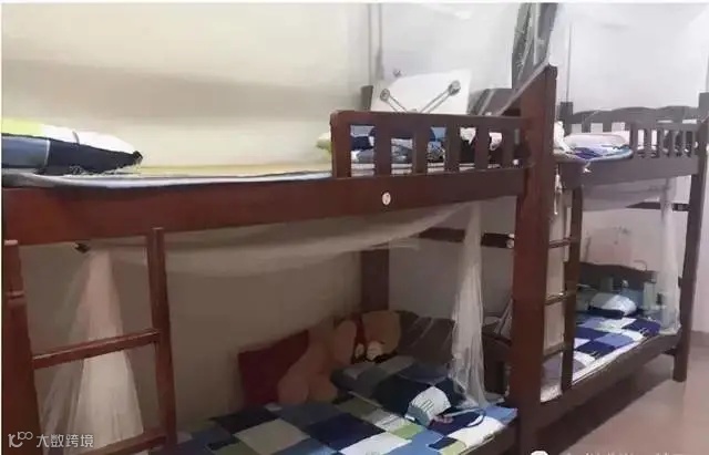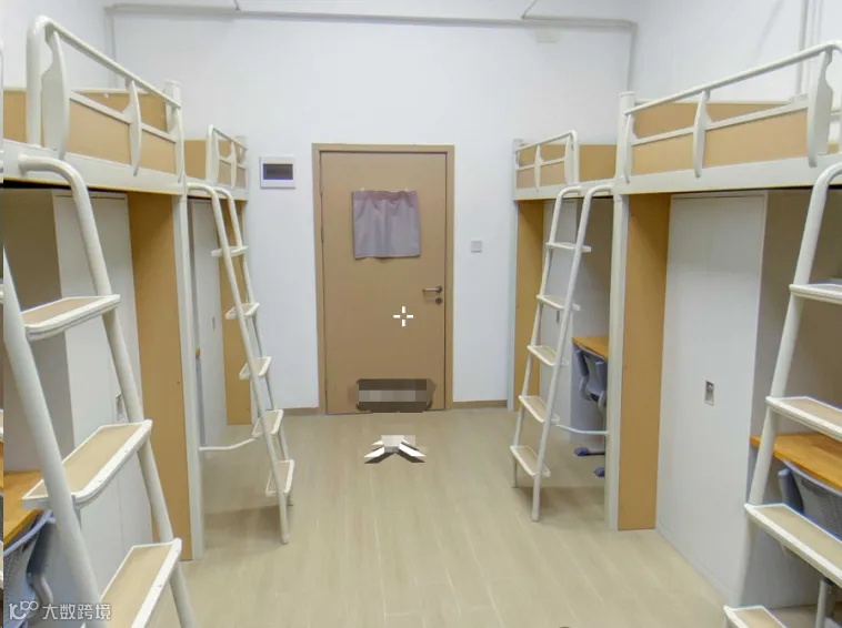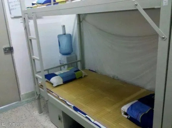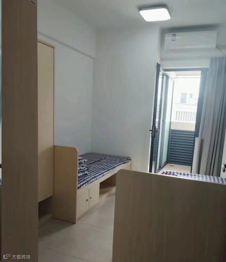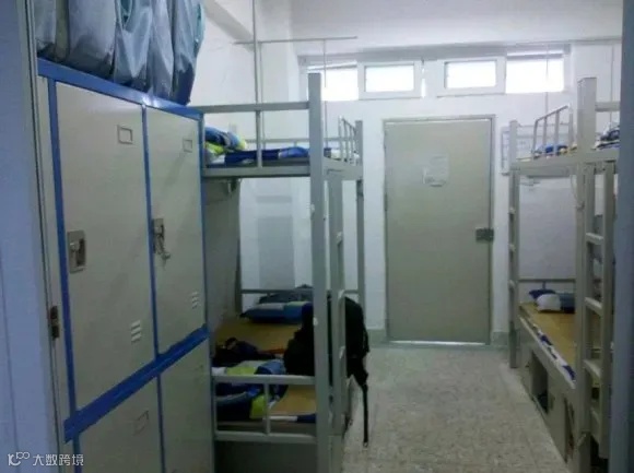 配置:有空调,有2个洗澡房(同时也是厕所),有一个阳台上面有几根钢管可以拿来挂衣服,阳台上有一个洗手台,洗手台是水槽状的,上面有3个水龙头床为木制上下铺,床上有可以放书本杂物的连体桌面。每个人还会分到一个柜子,柜子是上下层的,下面那层稍微小一点。