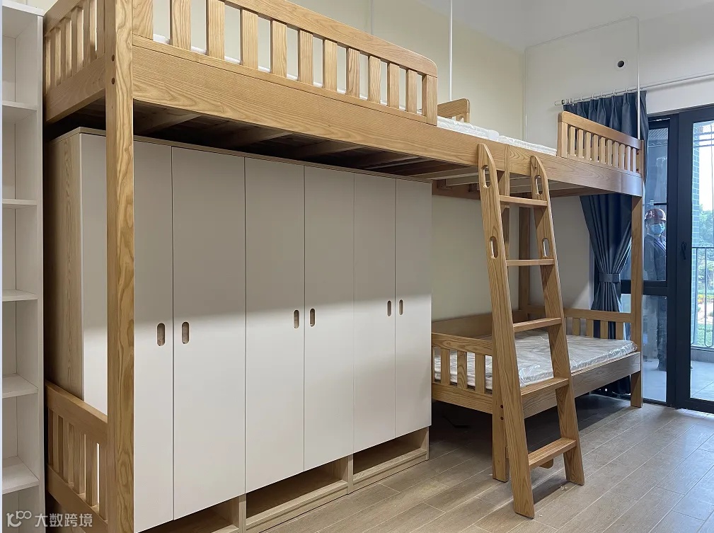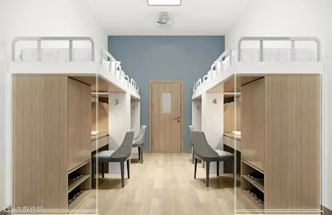 配置:宿舍均采用“2+1模块”(两间4人间卧室+1个卫生间),每间宿舍配有纯实木床,书桌、衣柜、书柜也均为实木材质,宿舍内还配有空调、风扇、独立卫生间、冲凉房、洗漱间,每栋宿舍楼均配置有全自动洗衣机、烘干机、洗鞋机等。