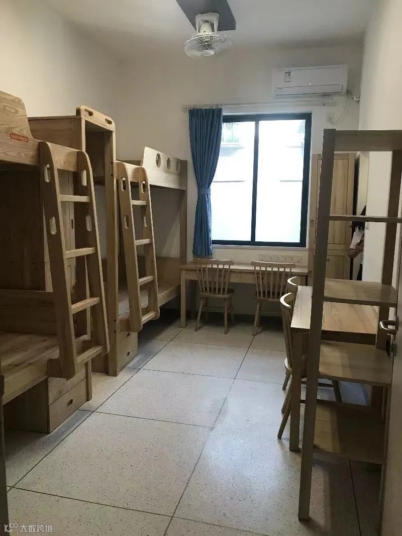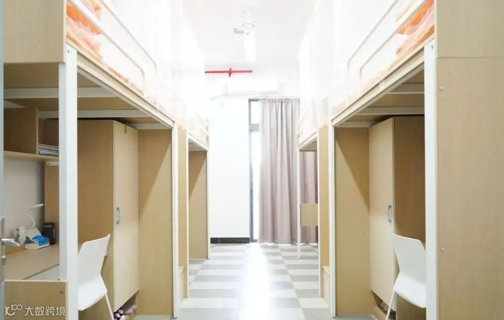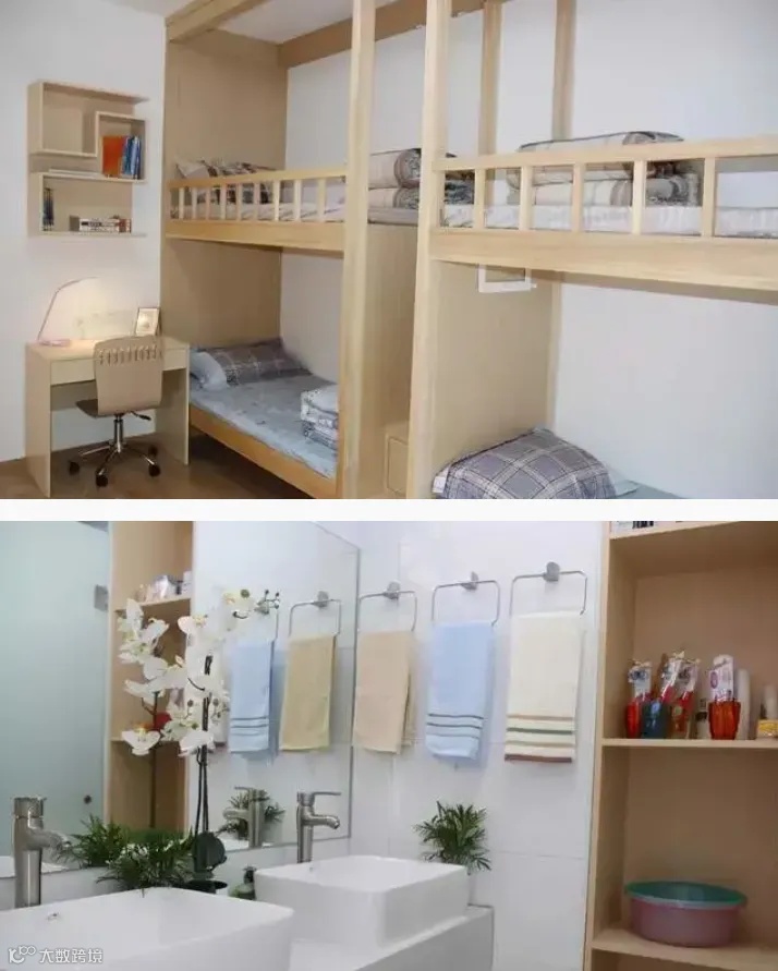 配置:宿舍有衣柜、空调、洗手间、淋浴间、洗脸台、饮水机等。木质上下铺、有空调、独立卫生间、楼层有洗衣房(3元/次)。旧宿舍配备一卫一浴,会陆续翻新,新宿舍已投入使用,带两卫两浴,配有衣柜、书架、桌椅。
