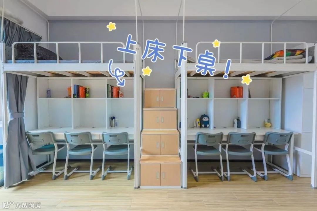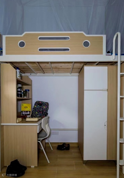 配置:学生宿舍写字台、书柜、衣柜和睡床组合,上床下桌,配双套独立卫浴、畅享风景小阳台。学校提供校服洗衣服务。以班级为单位,随机分配,标配上床下桌。