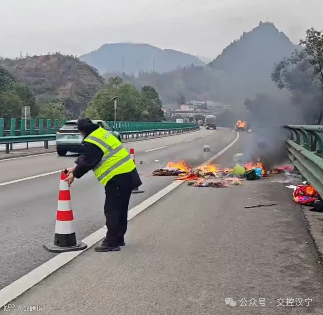 面对复杂局面,处置小组临危不乱,立即分工协作:一方面,迅速将皮卡车上的4名司乘人员转移至护栏外的安全区域,确保人员生命安全,并安抚其情绪;另一方面,在来车方向紧急摆放锥形桶,建立安全警示区域,并安排人员引导过往车辆减速避让、有序通行,有效避免了二次事故的发生。同时,在确保自身安全的情况下,对零星着火点进行扑灭。