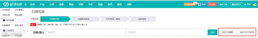 妙手ERP的扫描包装功能支持卖家在扫描订单标签后,自动打印箱唛和产品条码,提高卖家在打包发货时的操作速度,提升发货速度,避免超过平台规定的发货时效。