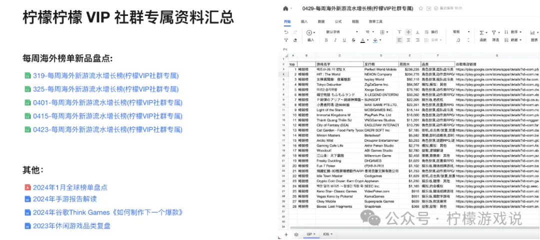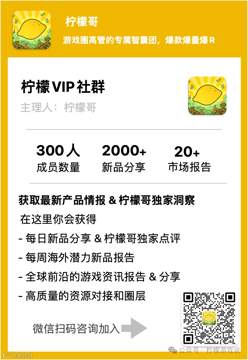2024年3月19日柠檬哥创立了「柠檬VIP社群」(付费加入),柠檬VIP社群定位:游戏圈高管的专属智囊团。目前VIP成员人数已超过300人,群内既有百亿身家的上市老板CEO,也有初创团队的核心成员,还有对小游戏赛道感兴趣的财务投资人,主要更多的都是一线操盘手,基本也覆盖了畅销榜头部的大部分发行和研发的操盘手。